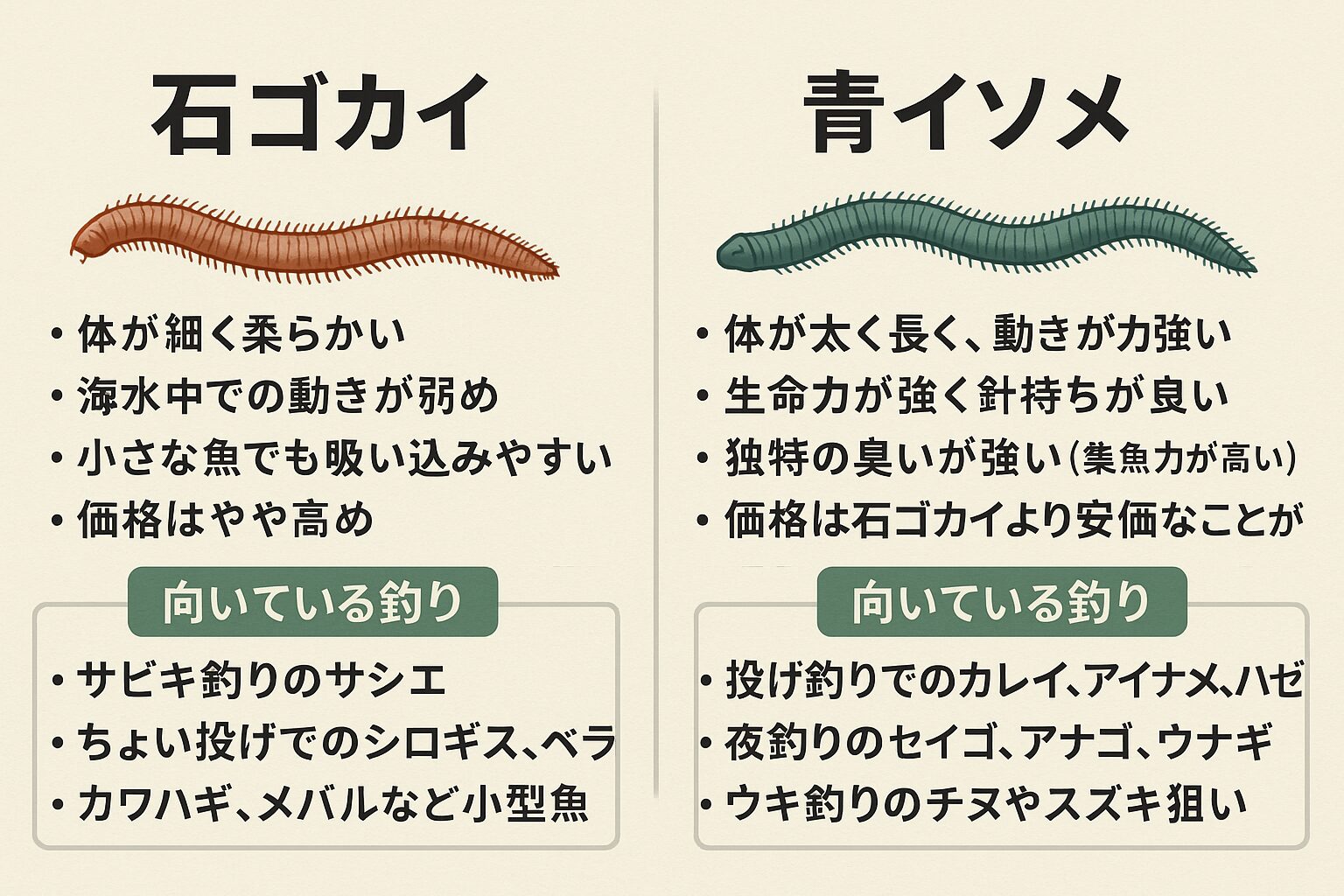 石ゴカイと青イソメの使い分け表