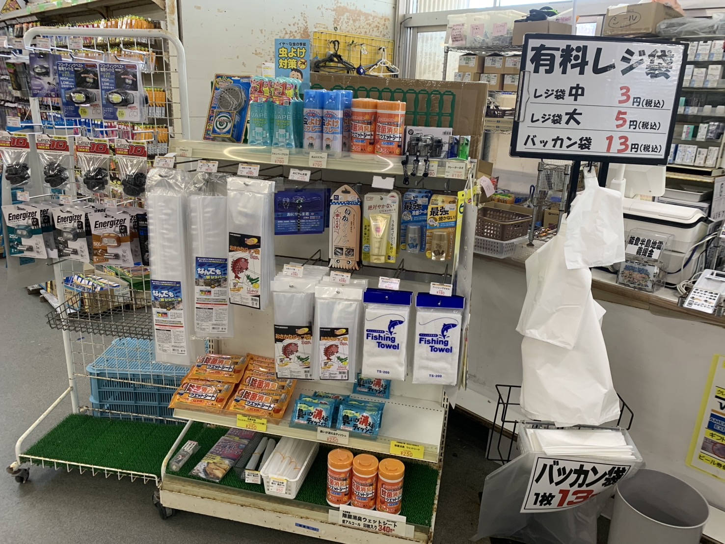レジ前にて袋類販売しております。