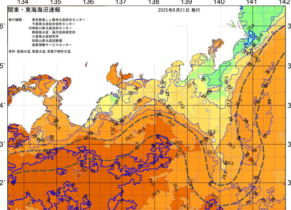 8月21日の黒潮図です。潮岬沖の近い所を流れています。