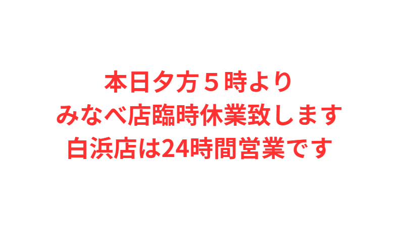 本日夕方5時より、みなべ店臨時休業致します。白浜店は24時間営業です。