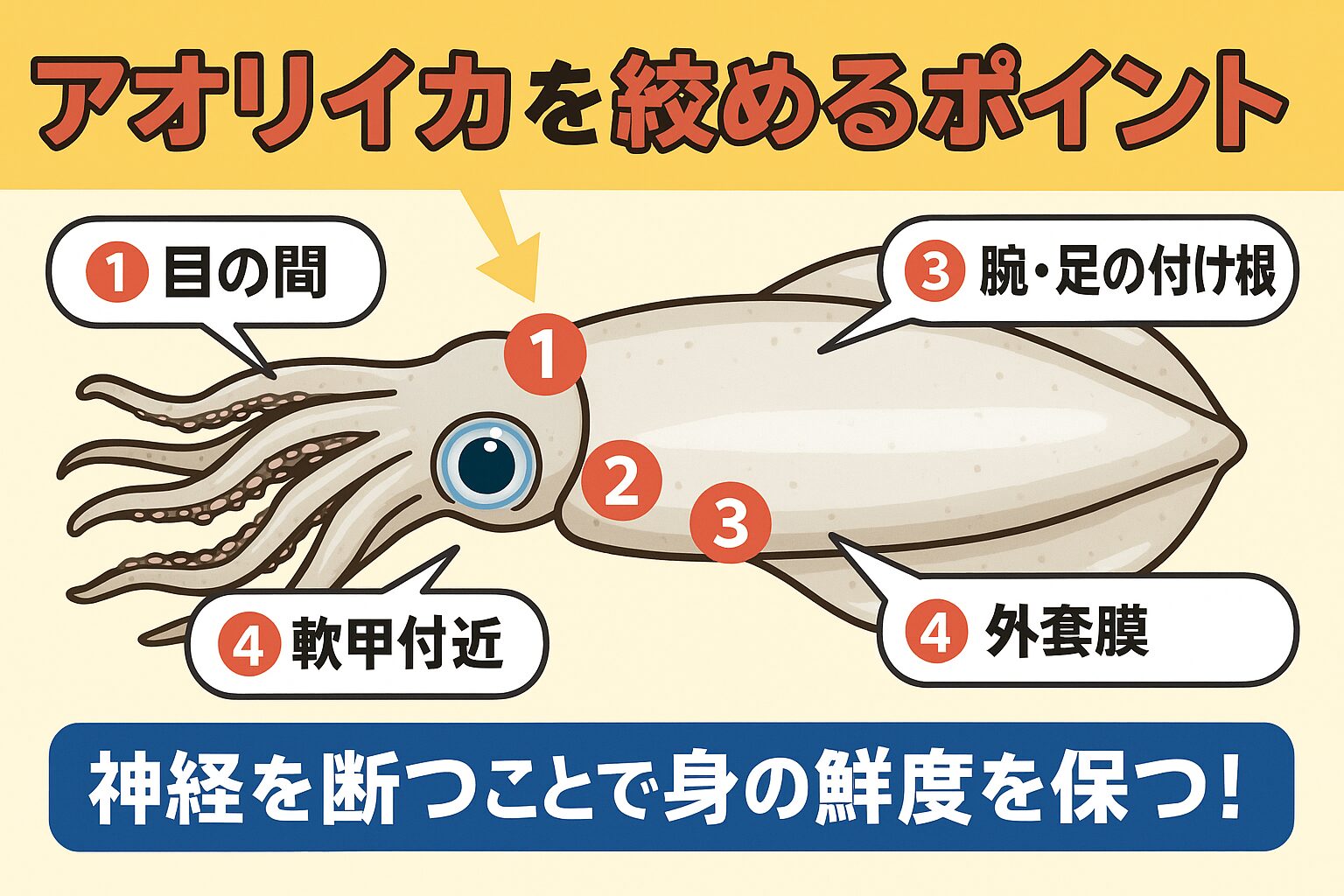 ② アオリイカを絞めるポイント(神経の位置4か所)