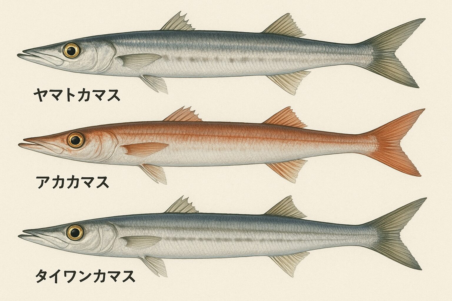 「タイワンカマス」の3種類があり、それぞれ見た目・味・釣れる季節に違いがあります。
