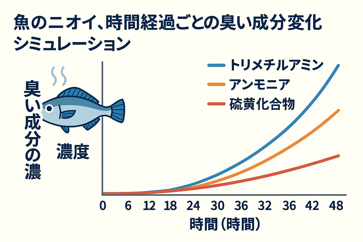 以下のグラフは、魚の死後0時間〜48時間までの間に、各臭気成分がどのように増加するかをシミュレーションしたものです。