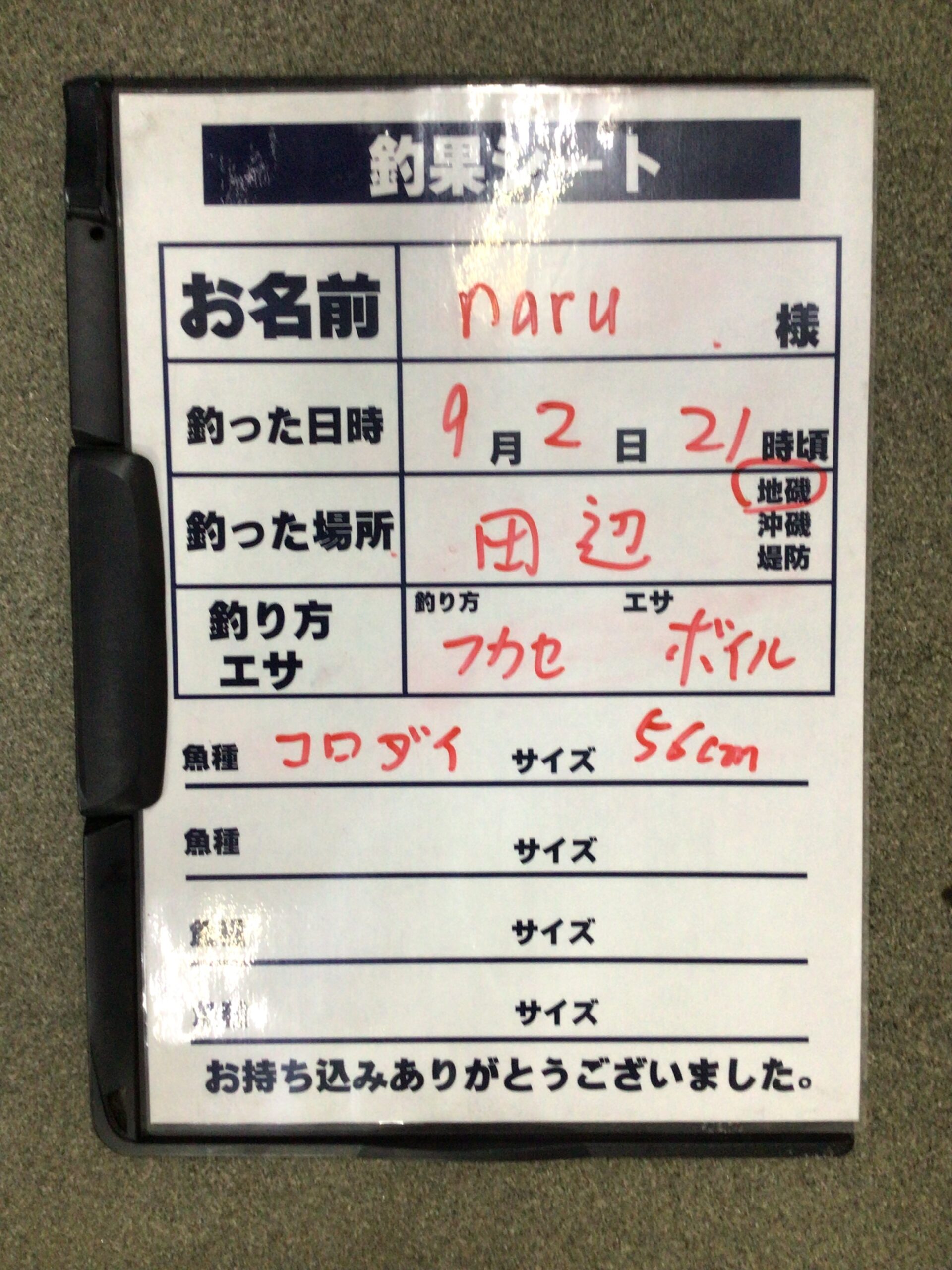 9月2日 NARU様 コロダイ56㎝の釣果。