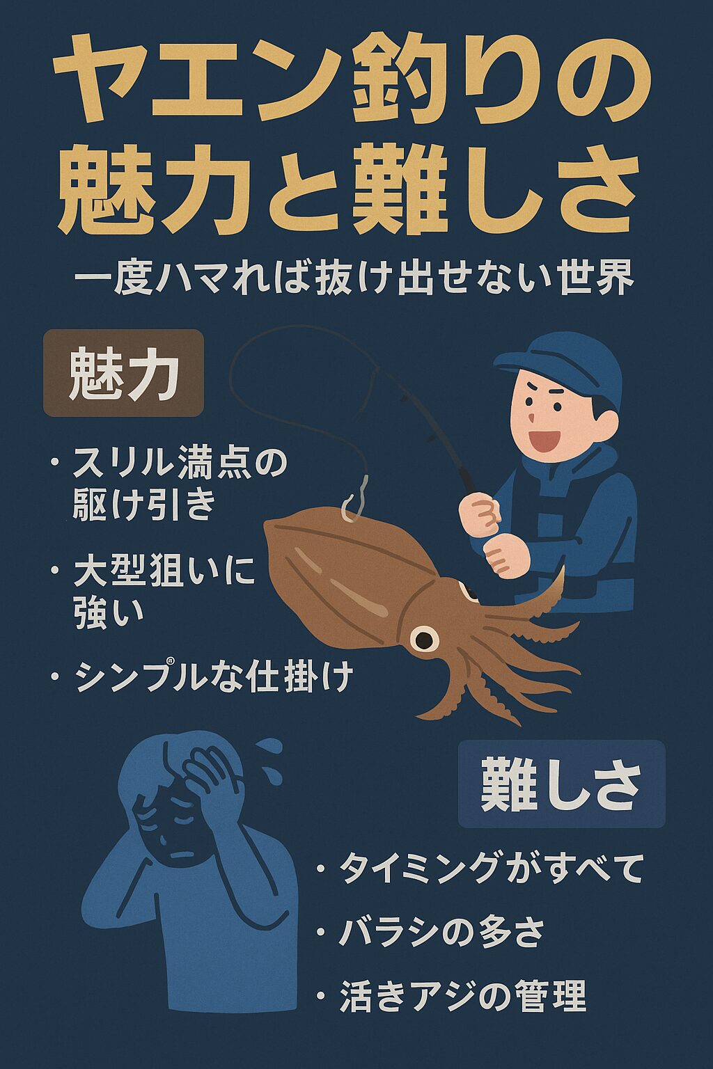 失敗と成功を繰り返す中で技術が磨かれていく――その過程自体がヤエン釣りの最大の魅力だといえるでしょう。