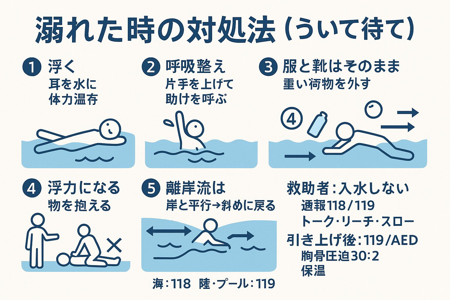 これらは「浮いて生き延びる」「ういて待て」の推奨と、離岸流での行動指針に基づく。 rnli.org安芸ライフセービングクラブHPoceantoday.noaa.gov+1