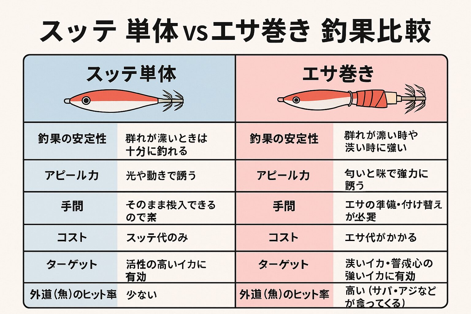 この記事では、スッテ単体とエサ巻きの釣果比較表を用意し、それぞれのメリット・デメリットや使い分けのポイントを解説します。