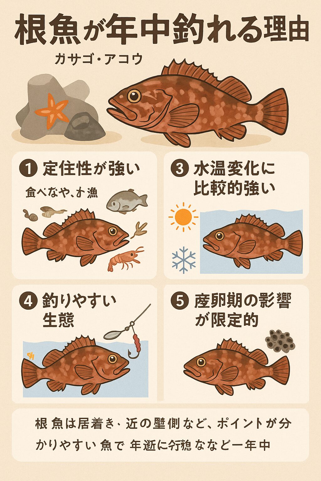 根魚は「居着き」「待ち伏せ型捕食」「水温耐性」が強い魚なので、季節に関係なく釣り人が狙えるターゲットです。
