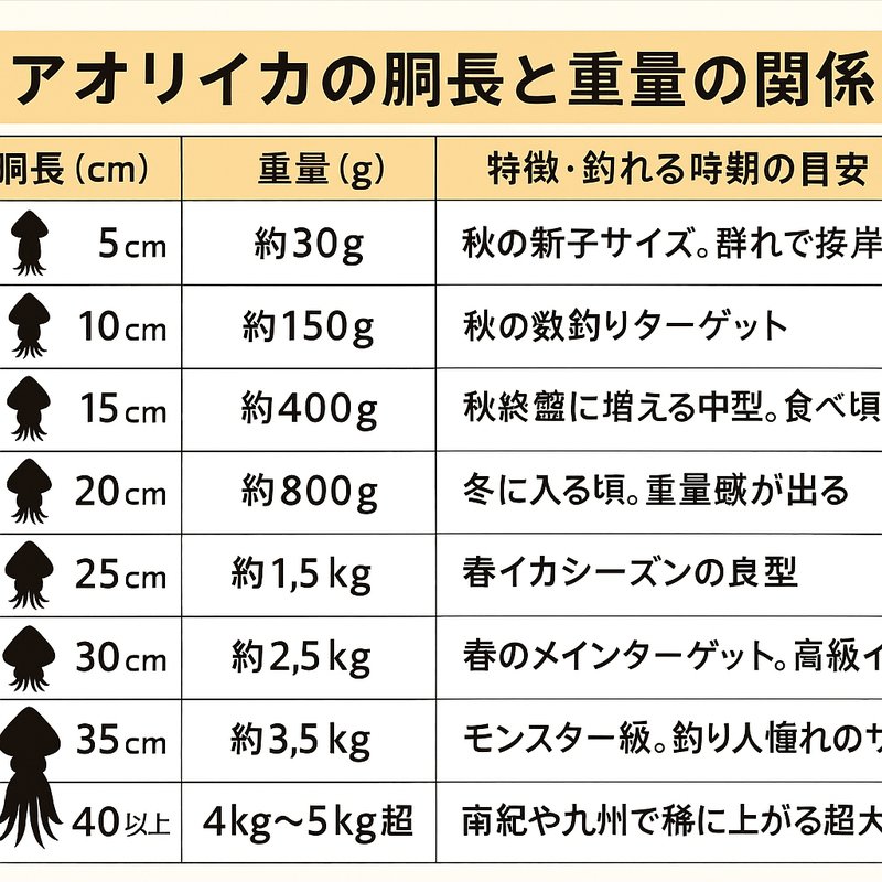 以下は、一般的な南紀地方をはじめとする日本沿岸で見られるアオリイカの胴長と重量の目安表です。