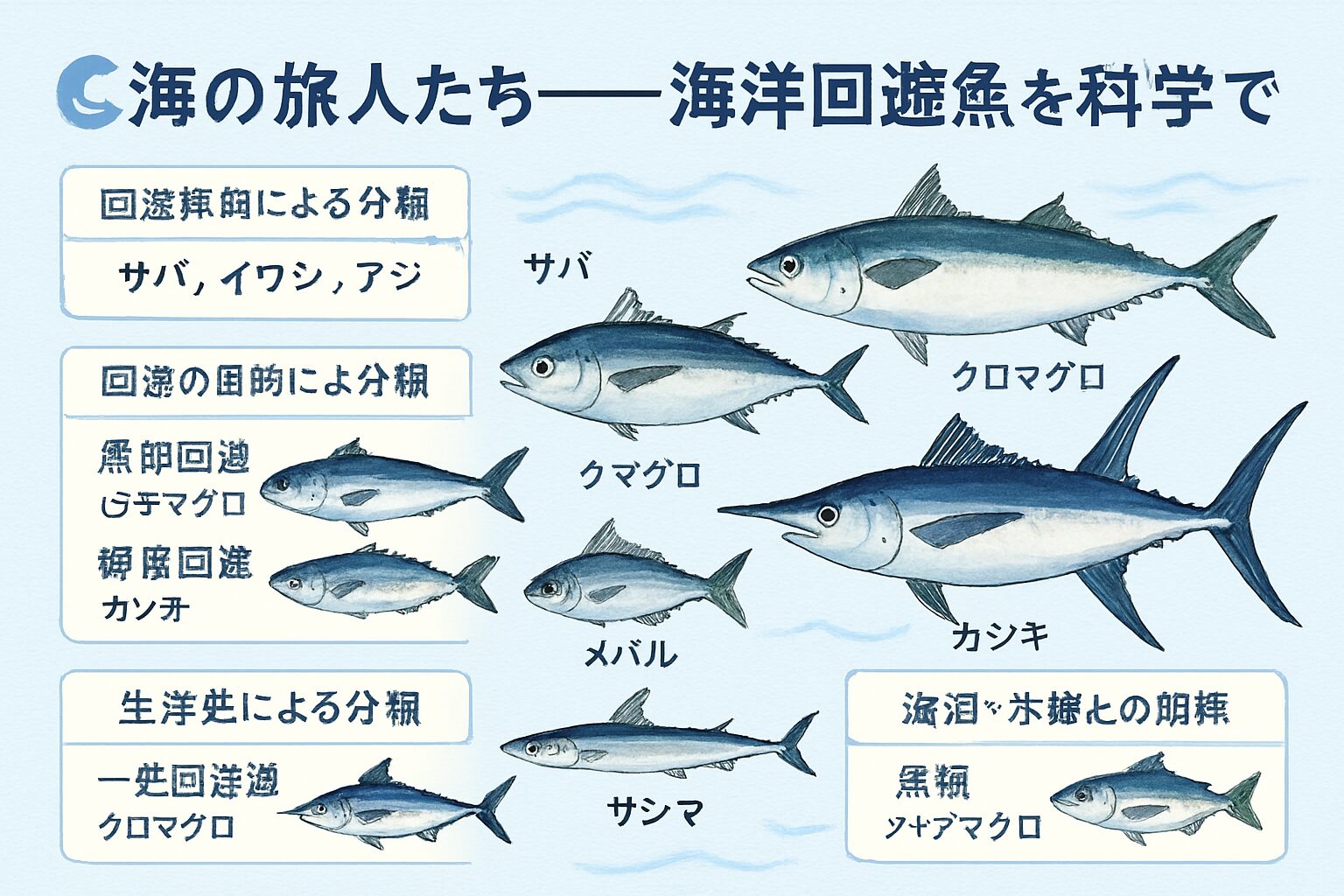 - 外洋回遊魚:外洋を長距離移動。例:マグロ、カジキ、カツオ