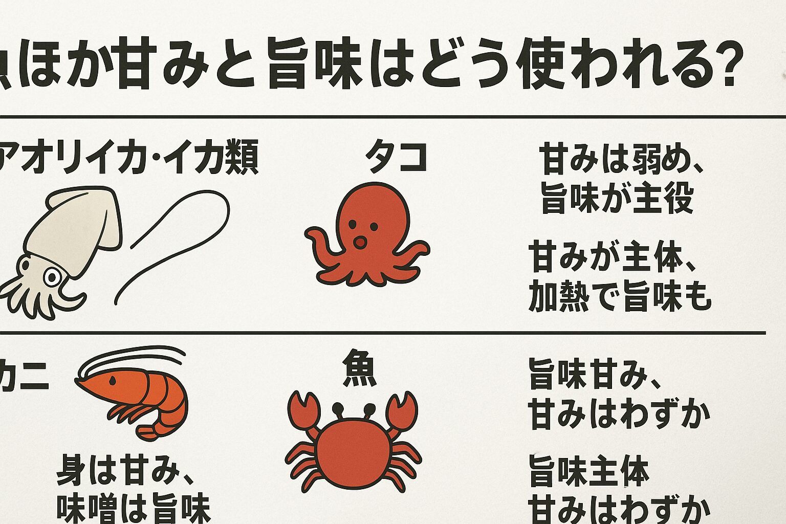 この記事では、イカ類・タコ・エビ・カニ、そして魚における「甘み」と「旨味」の使われ方を整理して解説します。