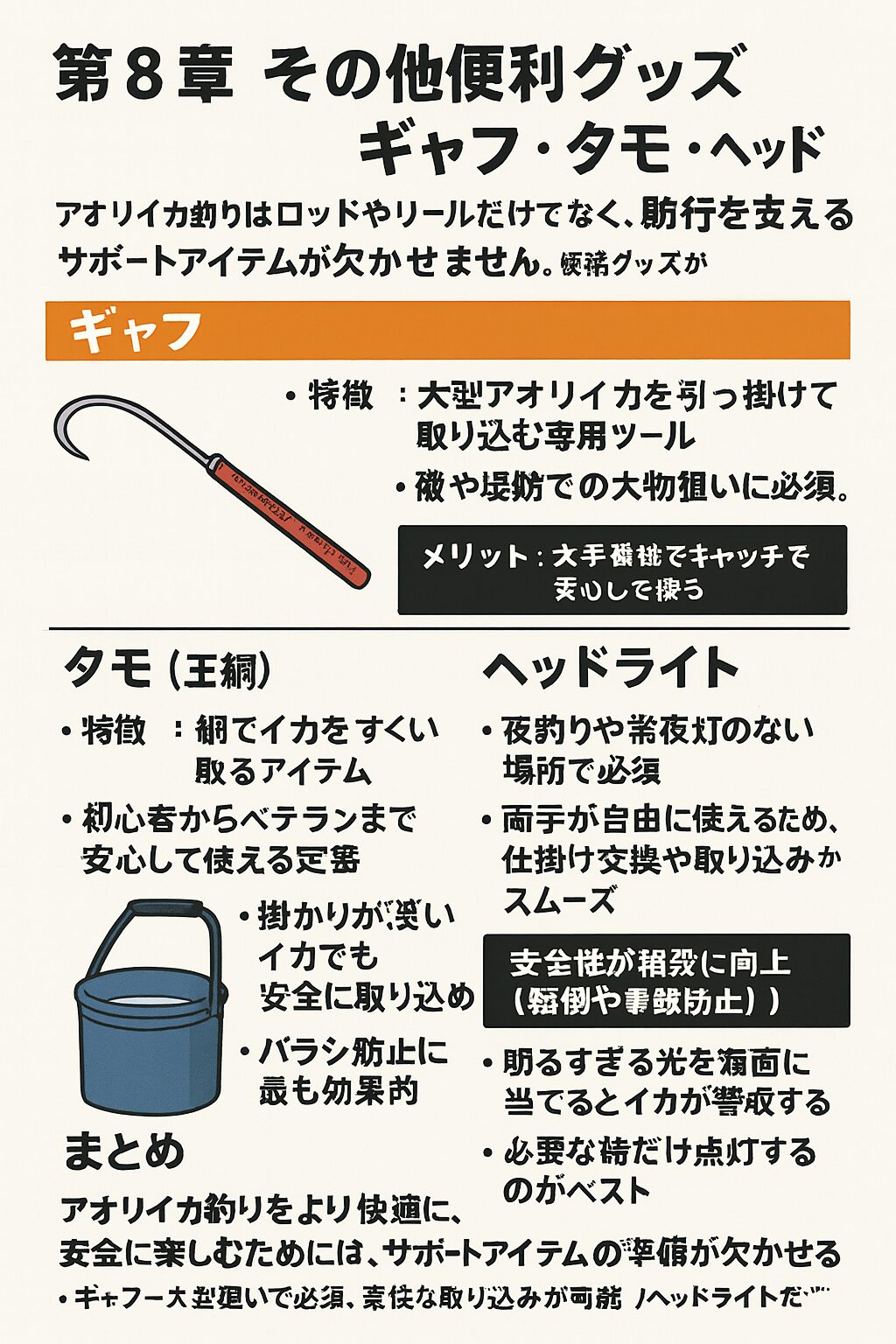 特に「ギャフ・タモ・ヘッドライト」は釣果と安全を支える三種の神器です。