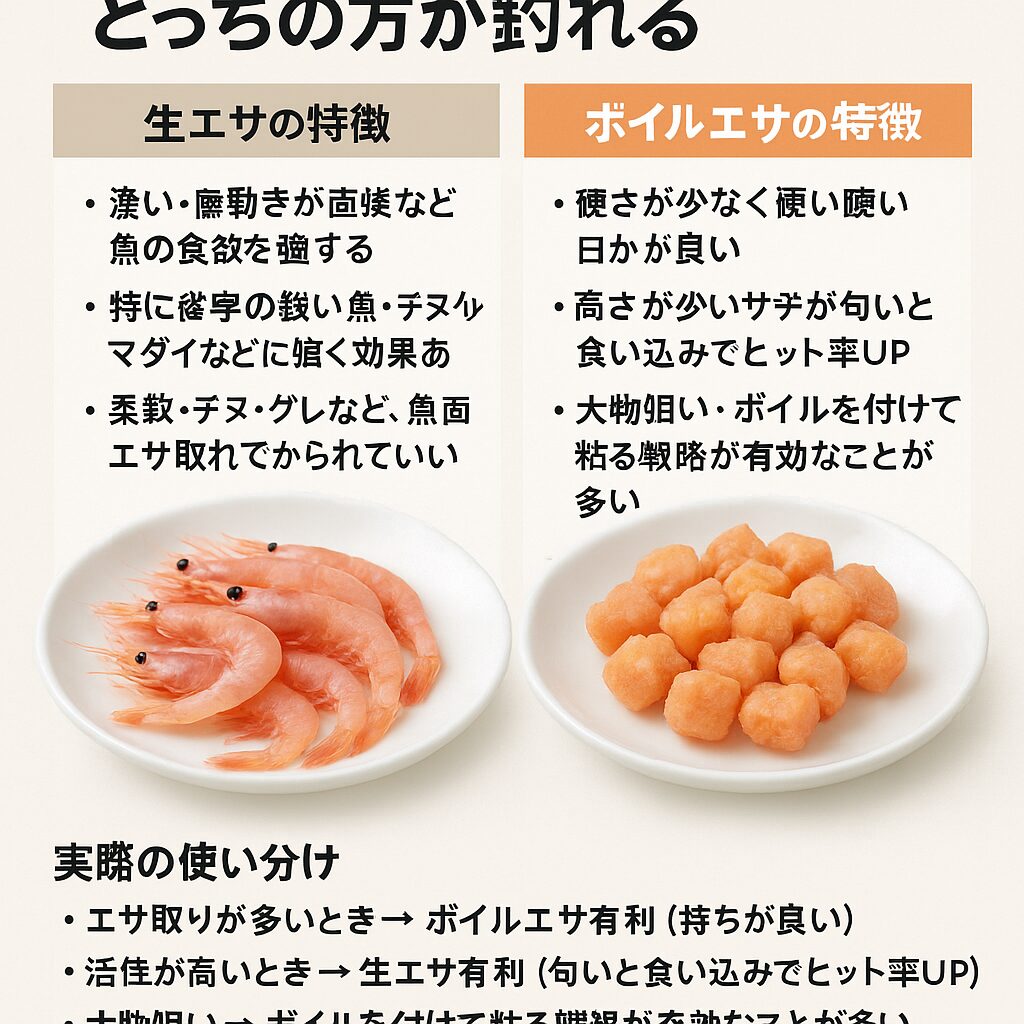 ・エサ取りが多いとき → ボイルエサ有利(持ちが良い)