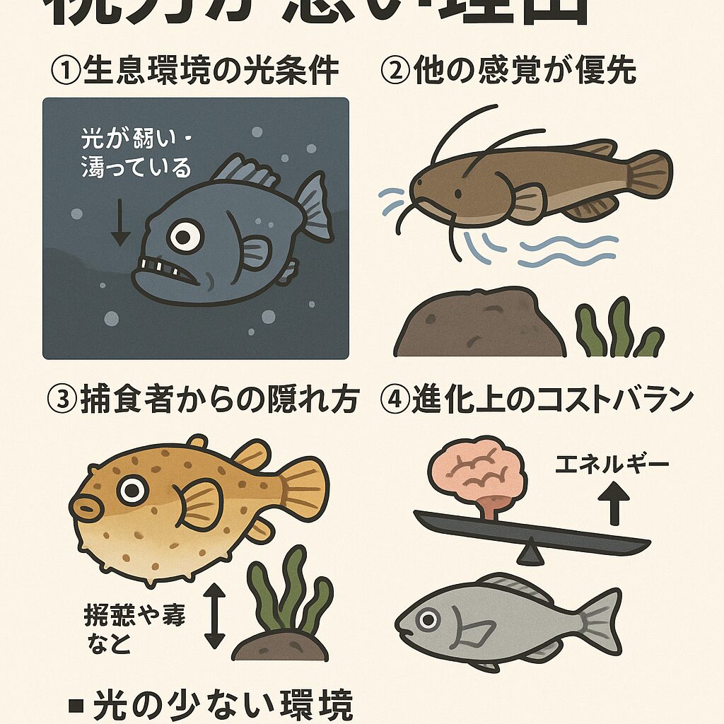 ・視力が悪くても、擬態や体色変化、岩陰に潜む習性などで身を守れる魚は、強い視力を維持する必要がありません。
