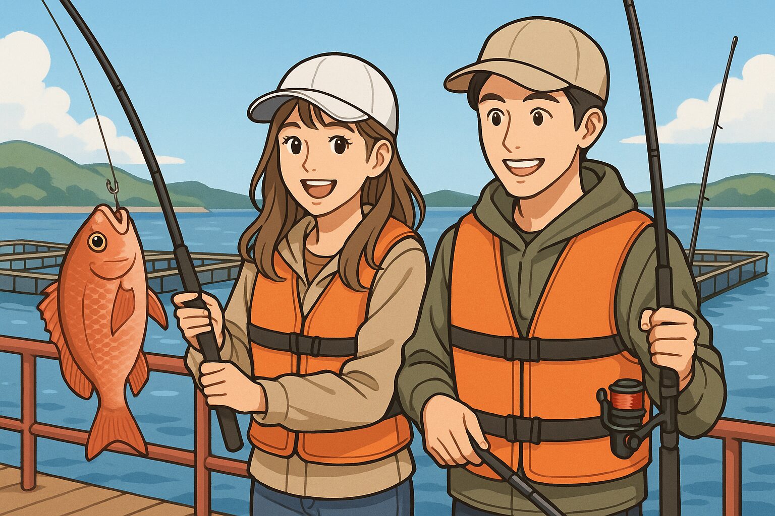 ブリ・カンパチ・タイ・ヒラメなど、自然の海ではなかなか釣れない大物が放流されており、初心者でも竿を出すだけで大物とのファイトを体験できます。