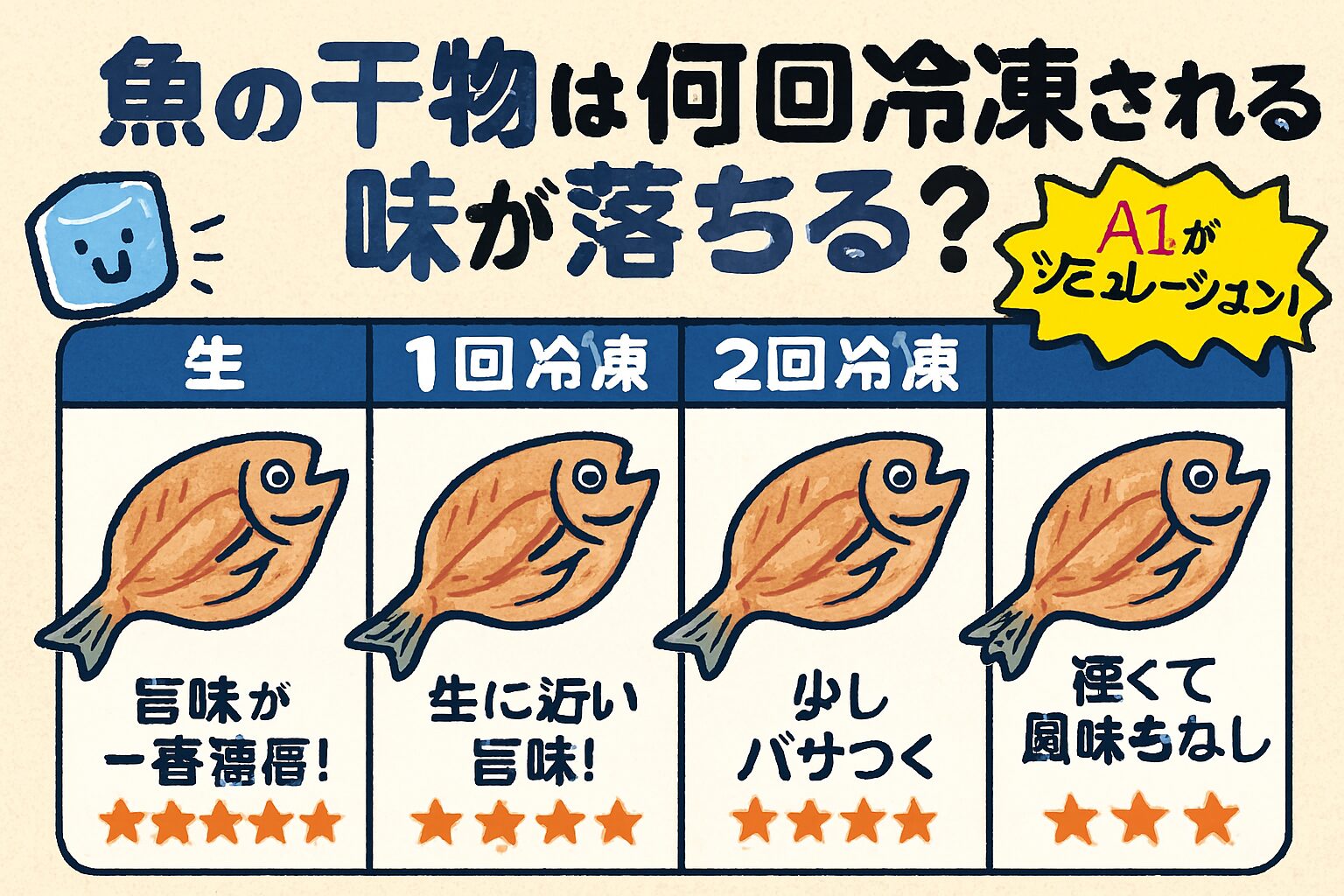 そこで今回は、生干物・1回冷凍・2回冷凍・3回冷凍の味の違いを、AIが科学的根拠に基づいてシミュレーション。