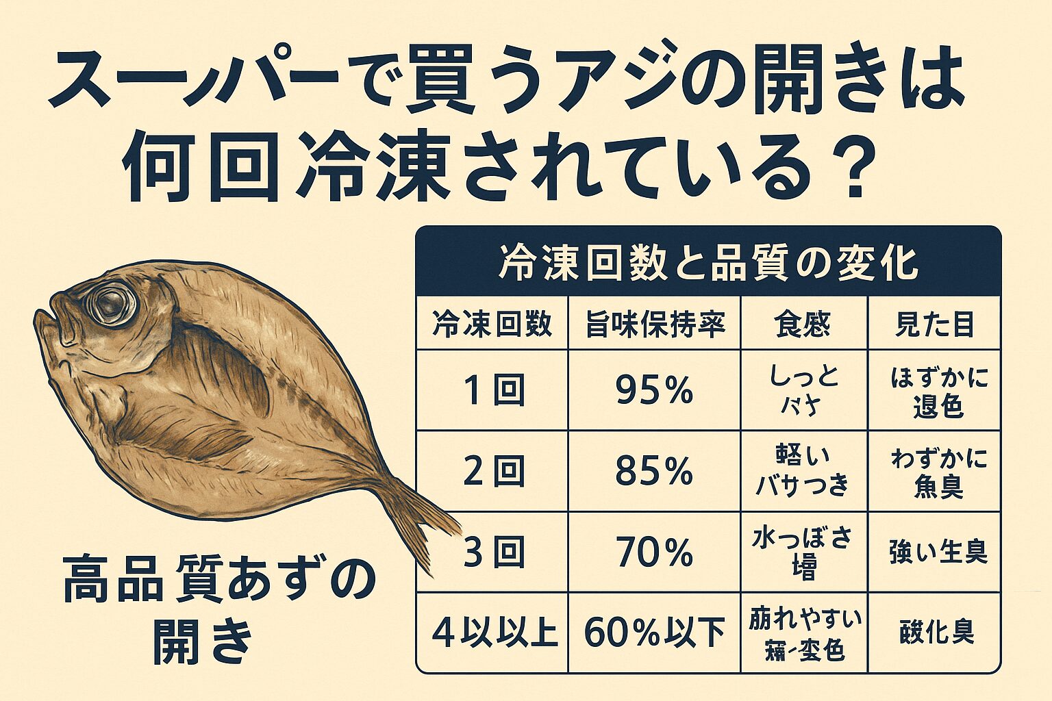 スーパーで買うアジの開きは、国内産で2〜3回、輸入品で3〜4回の冷凍が一般的。