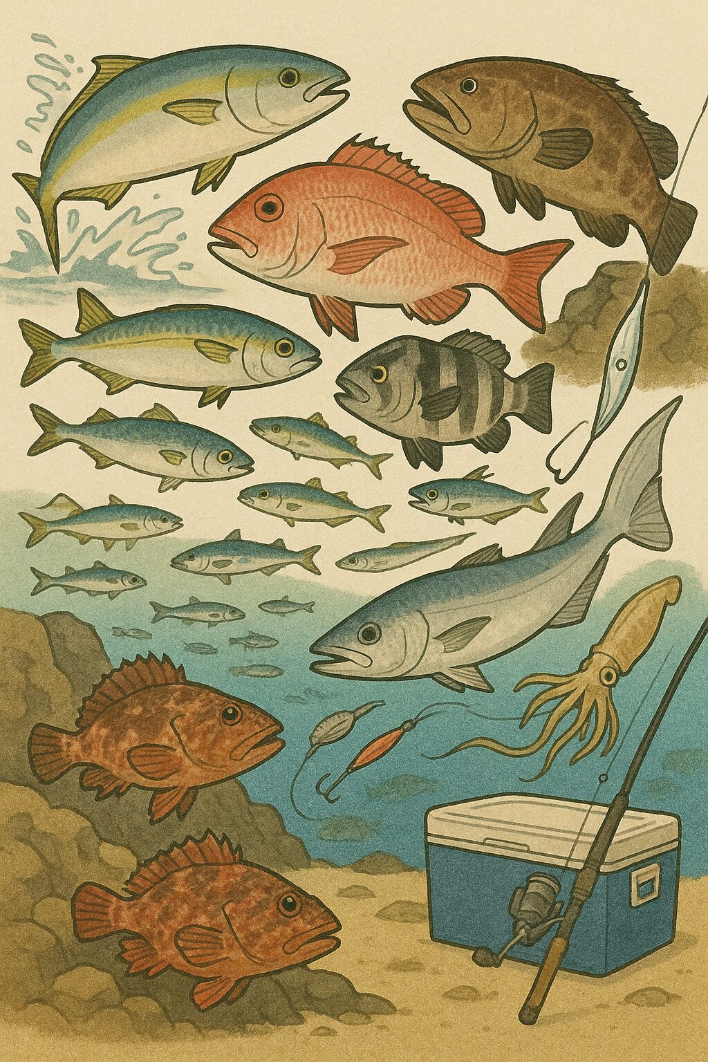 船釣り、底物釣り、泳がせ・餌釣りが中心。海況(潮・水温)良ければ魚種多様。 |