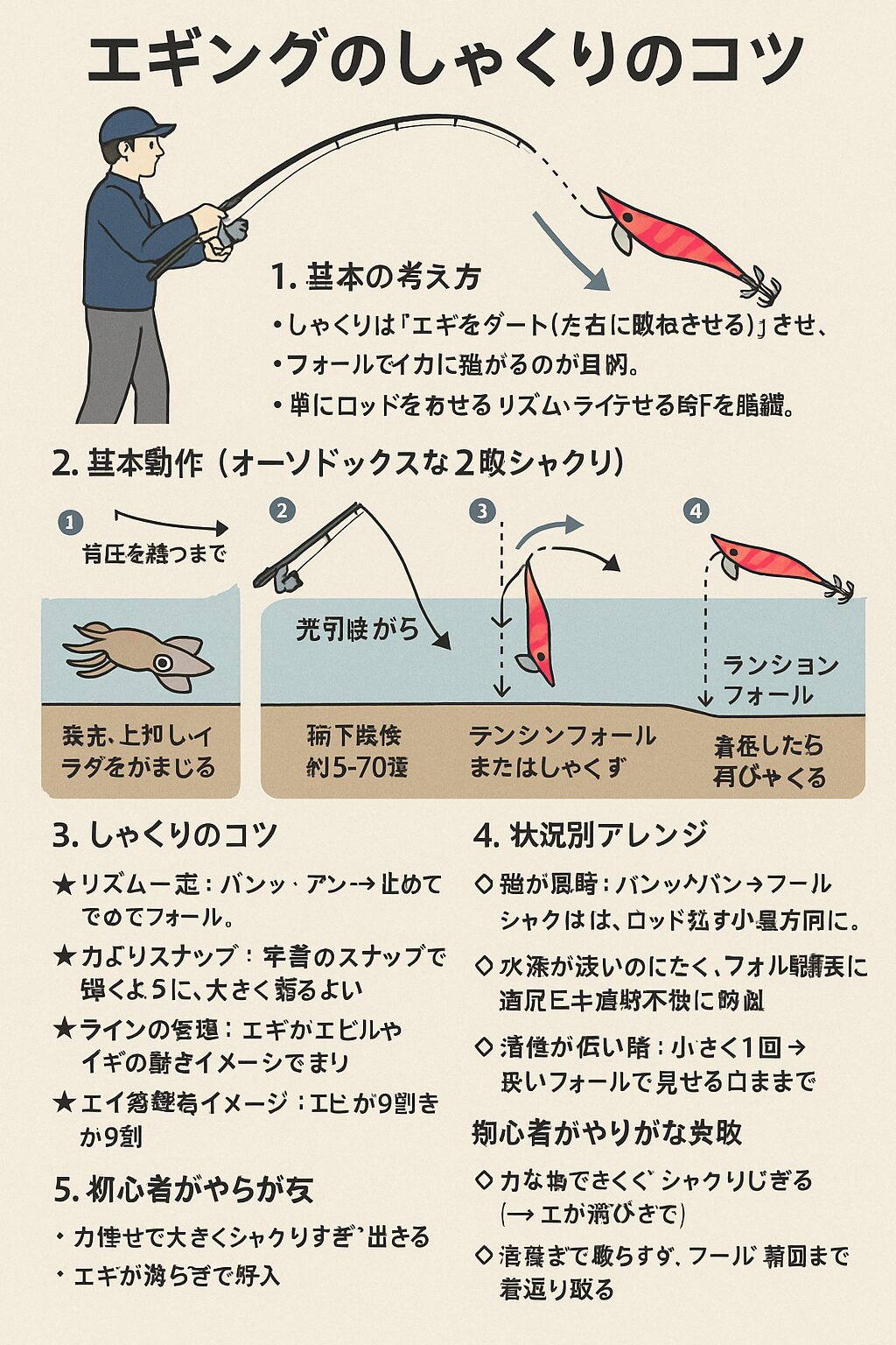 単にロッドを煽るだけでなく、リズム・ラインテンション・水中でのエギ姿勢を意識することで釣果が大きく変わります。