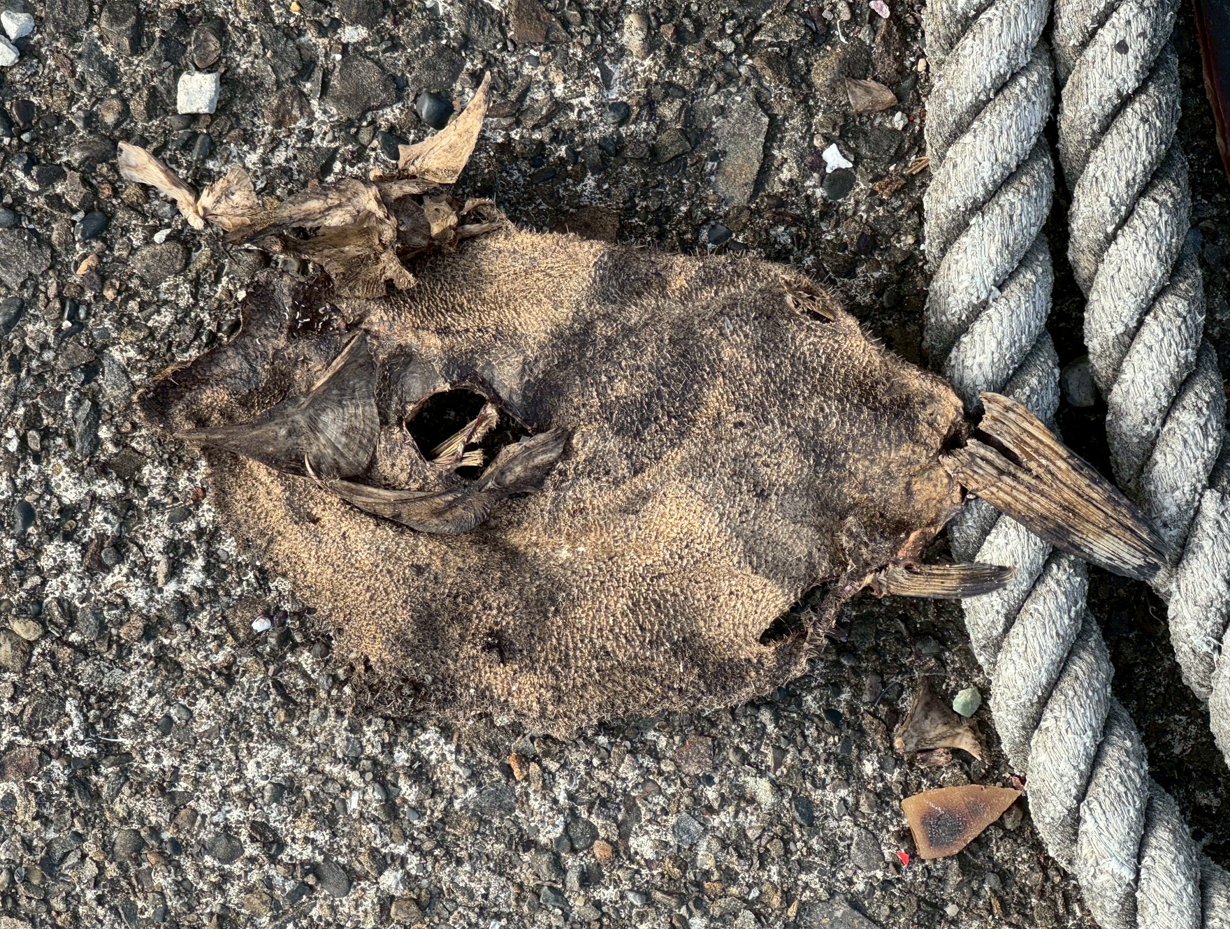 堤防や磯では、干からびた魚の残骸が落ちていることがあります。
