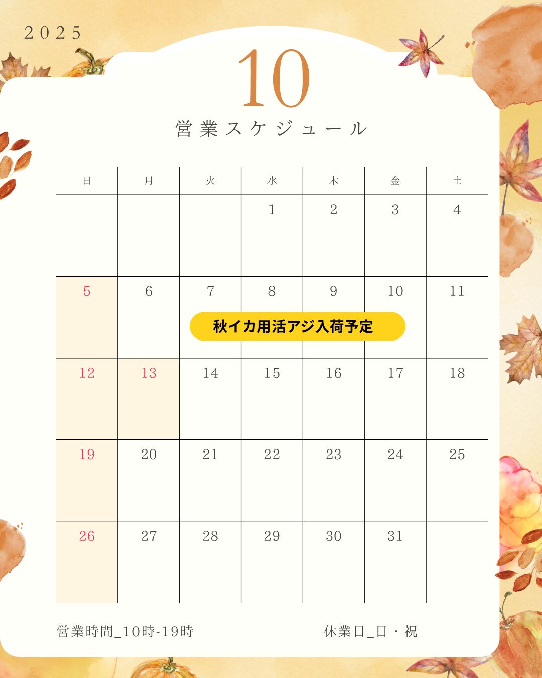 秋イカサイズの活アジは10月3連休までに入荷予定です。 活エサ入荷情報 2025.09.27 16~17cmサイズの活アジは、 現在、イケスでエサをあげて、太らせています。 アジが落ち着いてからの出荷となりますので、 あと2週間ほど掛かります。 それまでは、大きいアジ22cmサイズとなります。