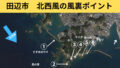 ・夕方〜夜間は表層〜中層に浮上し、立ち泳ぎで捕食するため、電気ウキ仕掛けやワインド釣法が有効です。