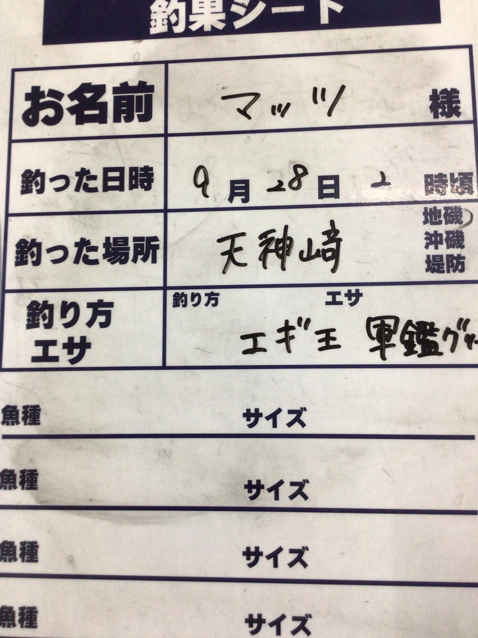 9/27 (土)天神崎にてアオリイカ280g エギ王軍艦グリーンにて
