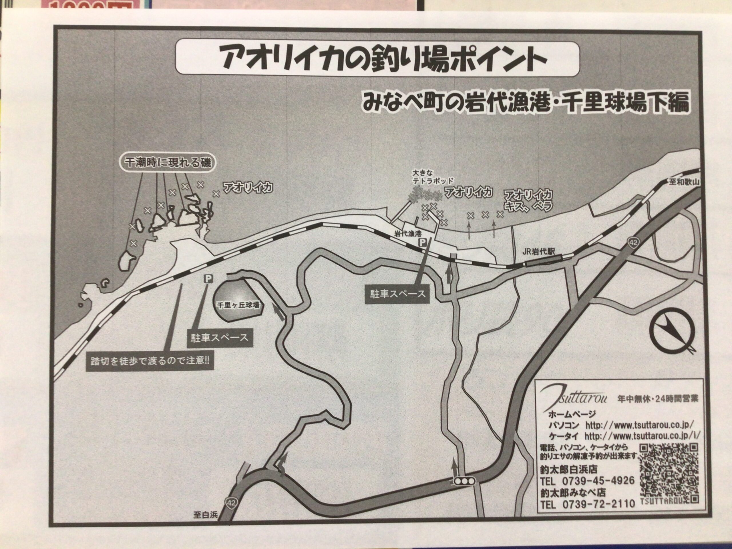 釣太郎みなべ店から右に出て北進。約7.4km先の信号を左折。道なりに直進すれば岩代漁港。約18分、8.1km。