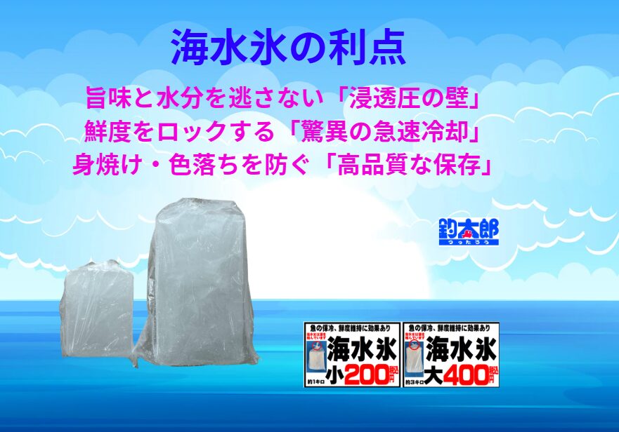 - 海水氷は、魚体全体をムラなく、かつ浸透圧差なく包み込むため、身の細胞を壊さず、色や食感を最高の状態で維持できます。これは、特に刺身や高級魚を扱う上で、プロが最も重視するポイントの一つです。