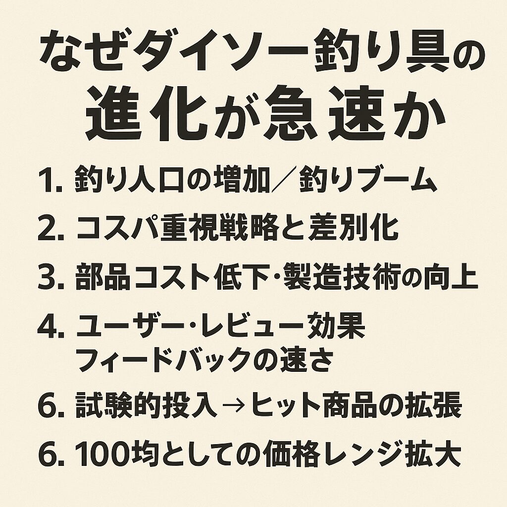「なぜ最近、ダイソー(および100円ショップ)の釣り道具が急激に“進化”してきているように見えるか」には、複数の要因が絡み合っていると思います。以下、考えられる理由を整理します。