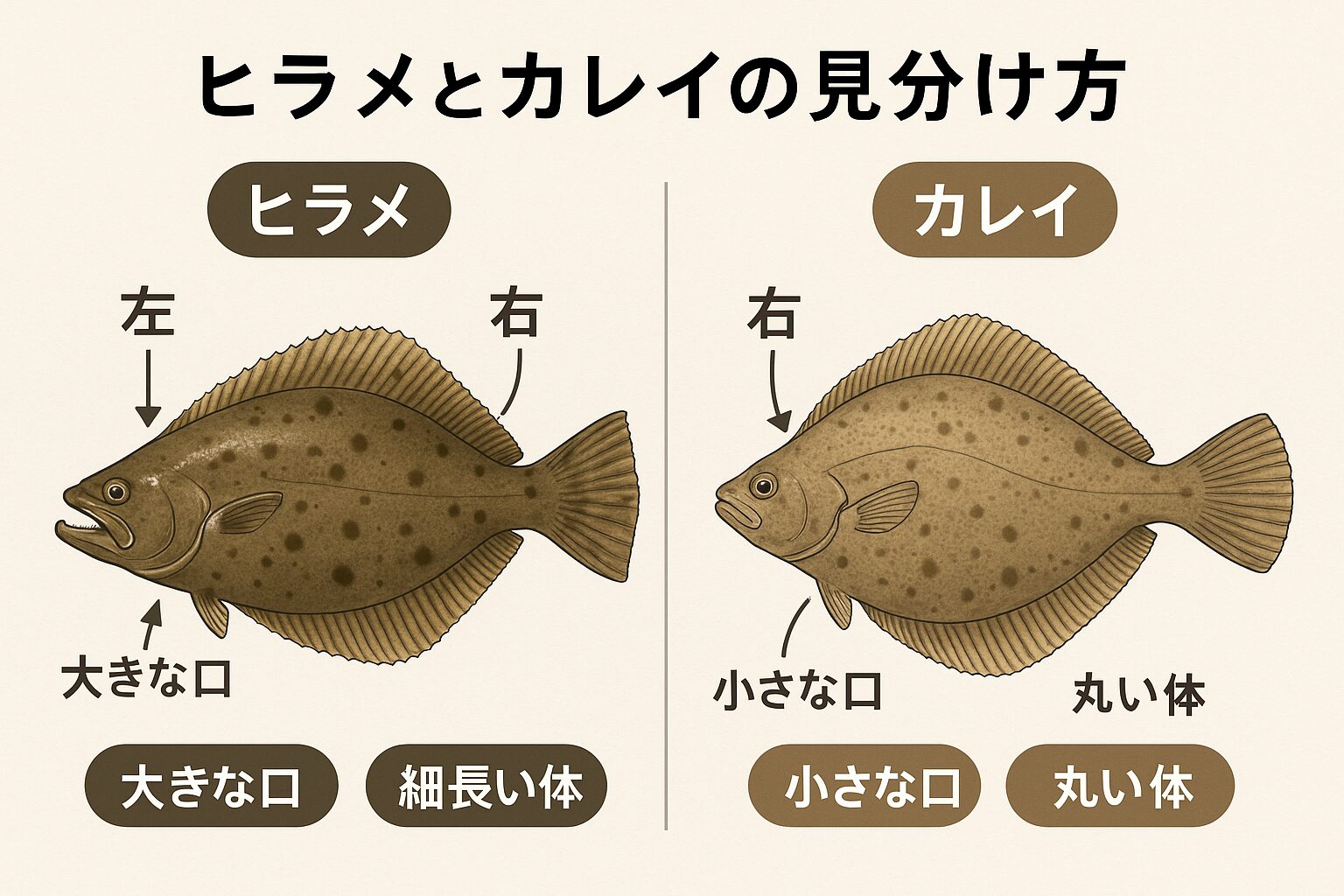 「目の位置」→ 左ならヒラメ、右ならカレイ
