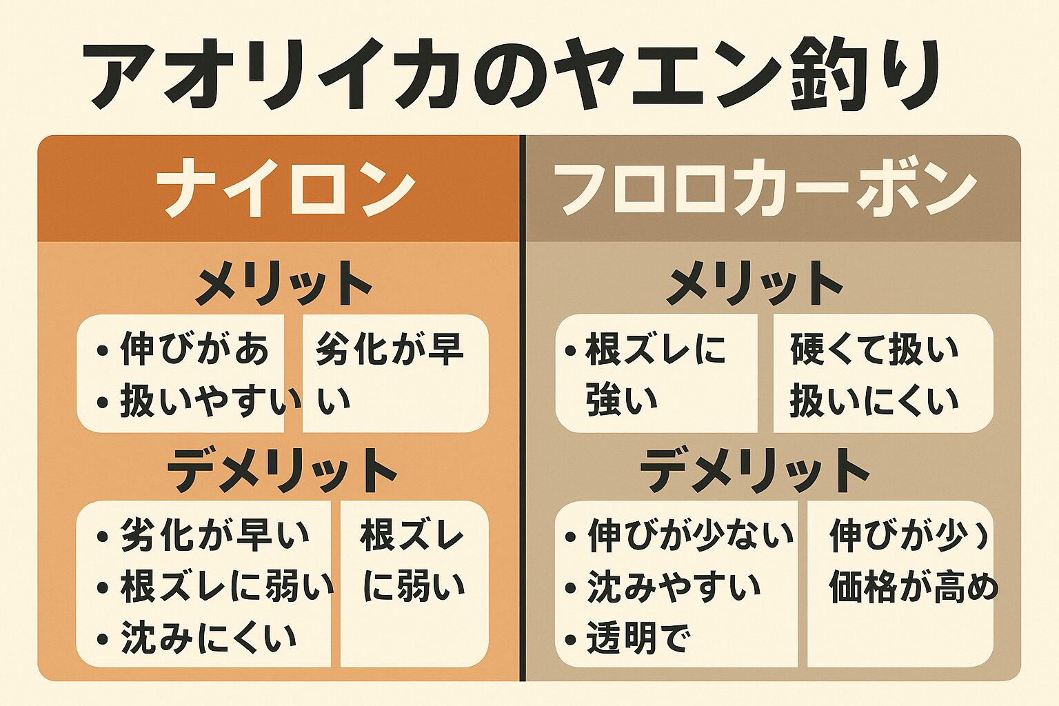 この記事では、ナイロンとフロロの違いをわかりやすく比較し、ヤエン釣り初心者から