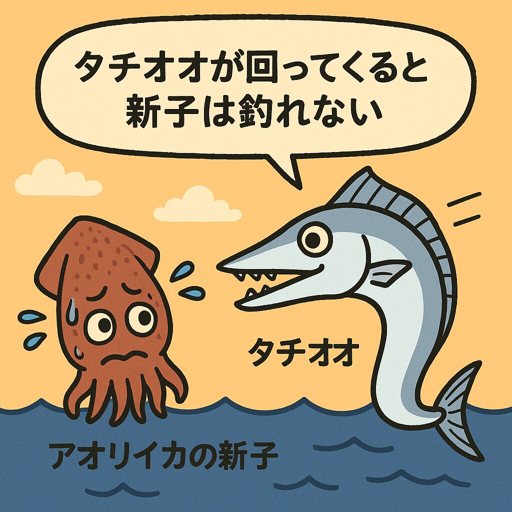 そのため、タチウオが近くに回遊してくると、新子イカは捕食を恐れてエサを追わなくなり、釣り人のエギにも反応しづらくなるのです。