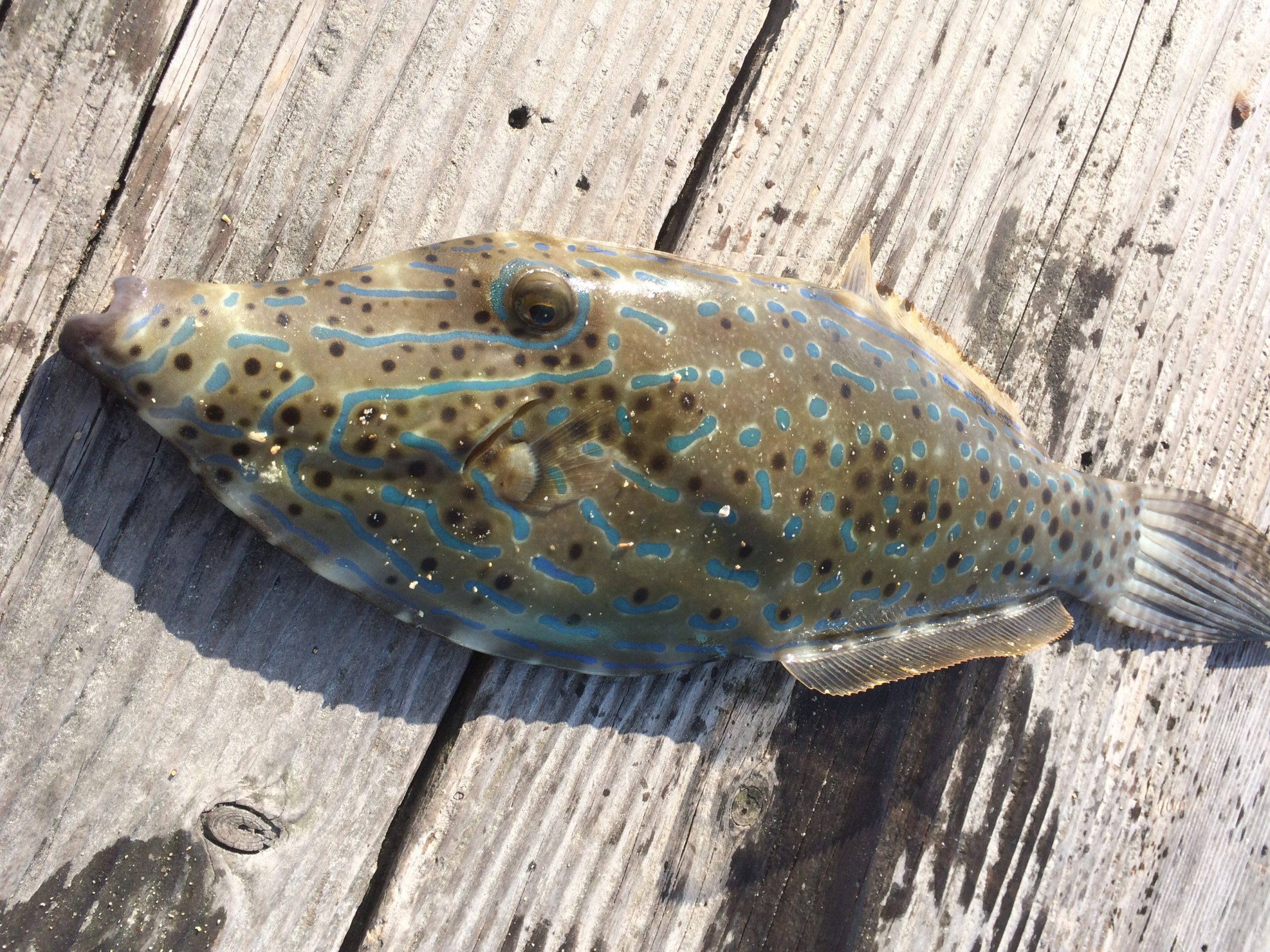 - ソウシハギ:青い波状の線と黒い斑点。派手で奇抜な模様。