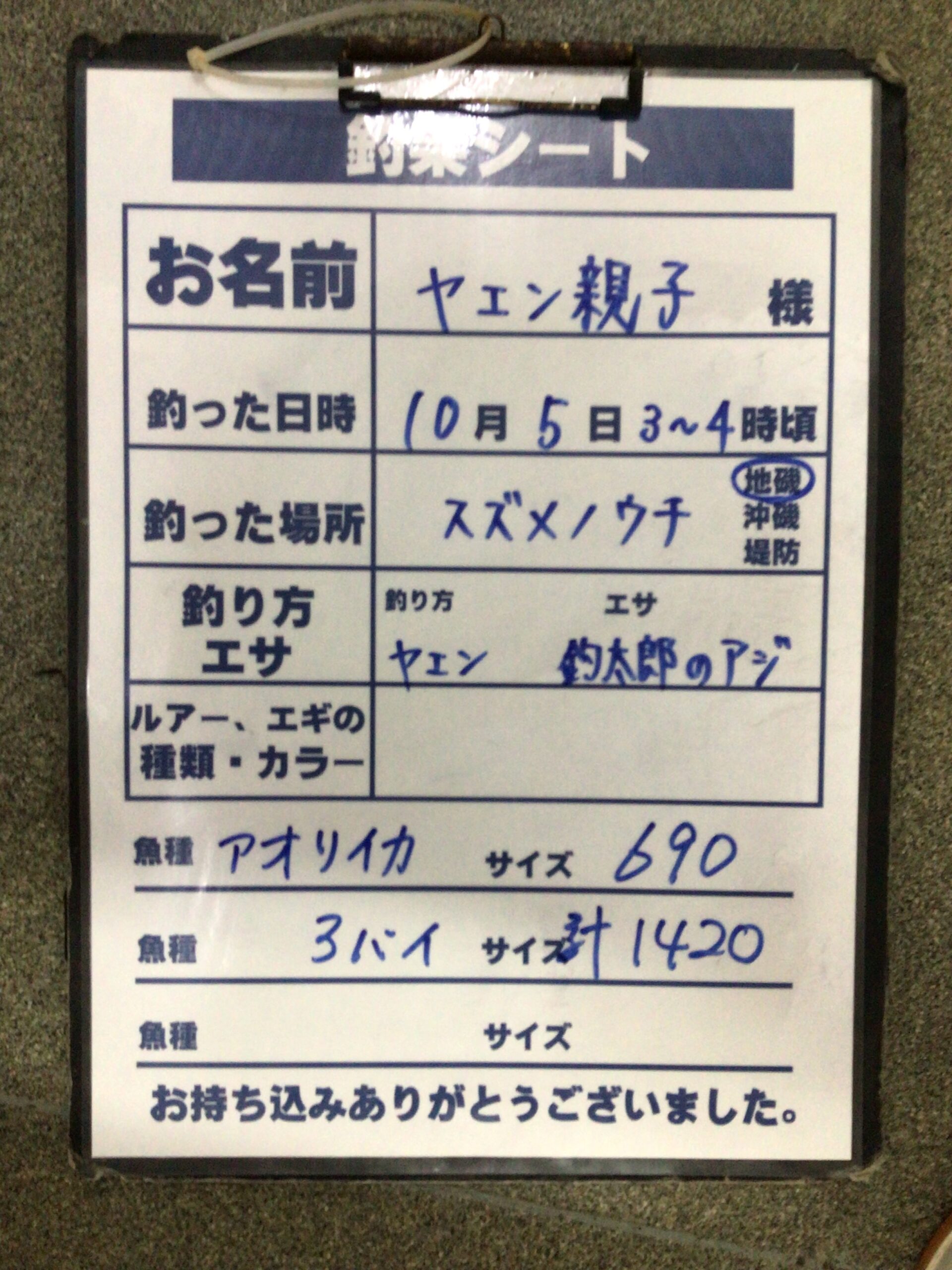 10月5日 ヤエン親子様 アオリイカの釣果。