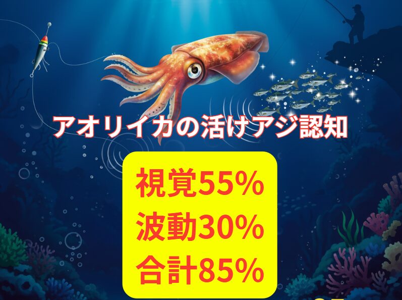 アオリイカがアジを見つけるメカニズムは、**視覚(55%)と波動(30%)で大部分(85%)を占めています。