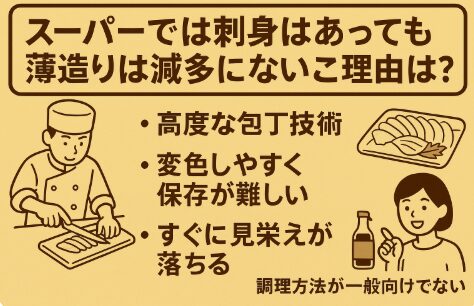 フグやヒラメ、タイなど薄造りに向く魚があるのに、なぜスーパーでは扱われないのでしょうか?