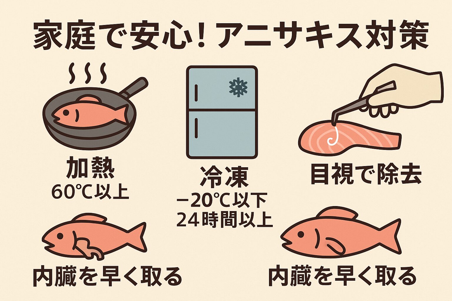家庭でのアニサキス対策は「加熱・冷凍・早期処理」。