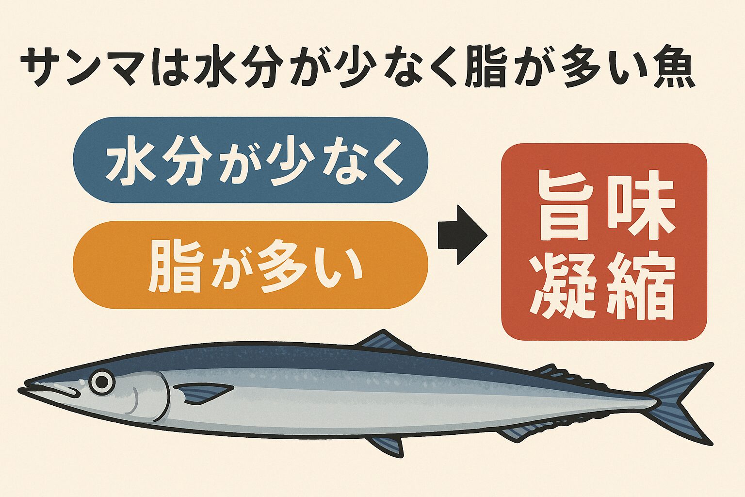 この比較表からもわかるように、サンマは脂肪率が最も高く、水分率が低い「旨味凝縮型」の魚です。