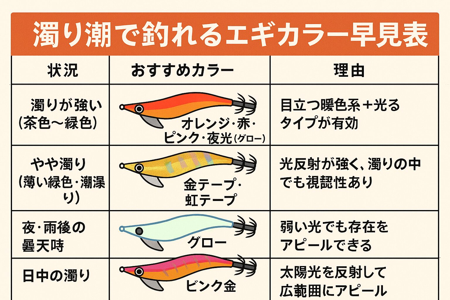 | 濁りが強い(茶色〜緑色) | オレンジ・赤・ピンク・夜光(グロー) | 目立つ暖色系+光るタイプが有効 |