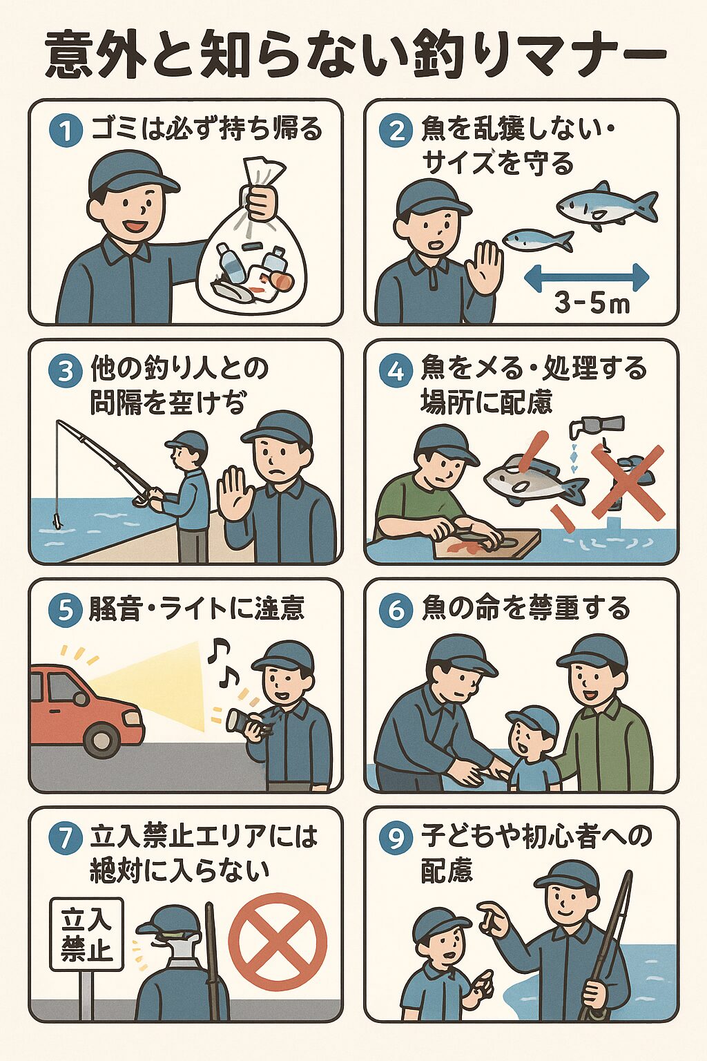 ・夜釣りでは特に「話し声」「車のドア音」「ライトの光」に注意。