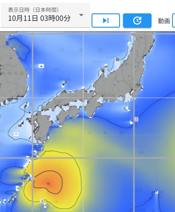 うねりは波周期10秒前後、波高1.5~2m前後の波モデルです。