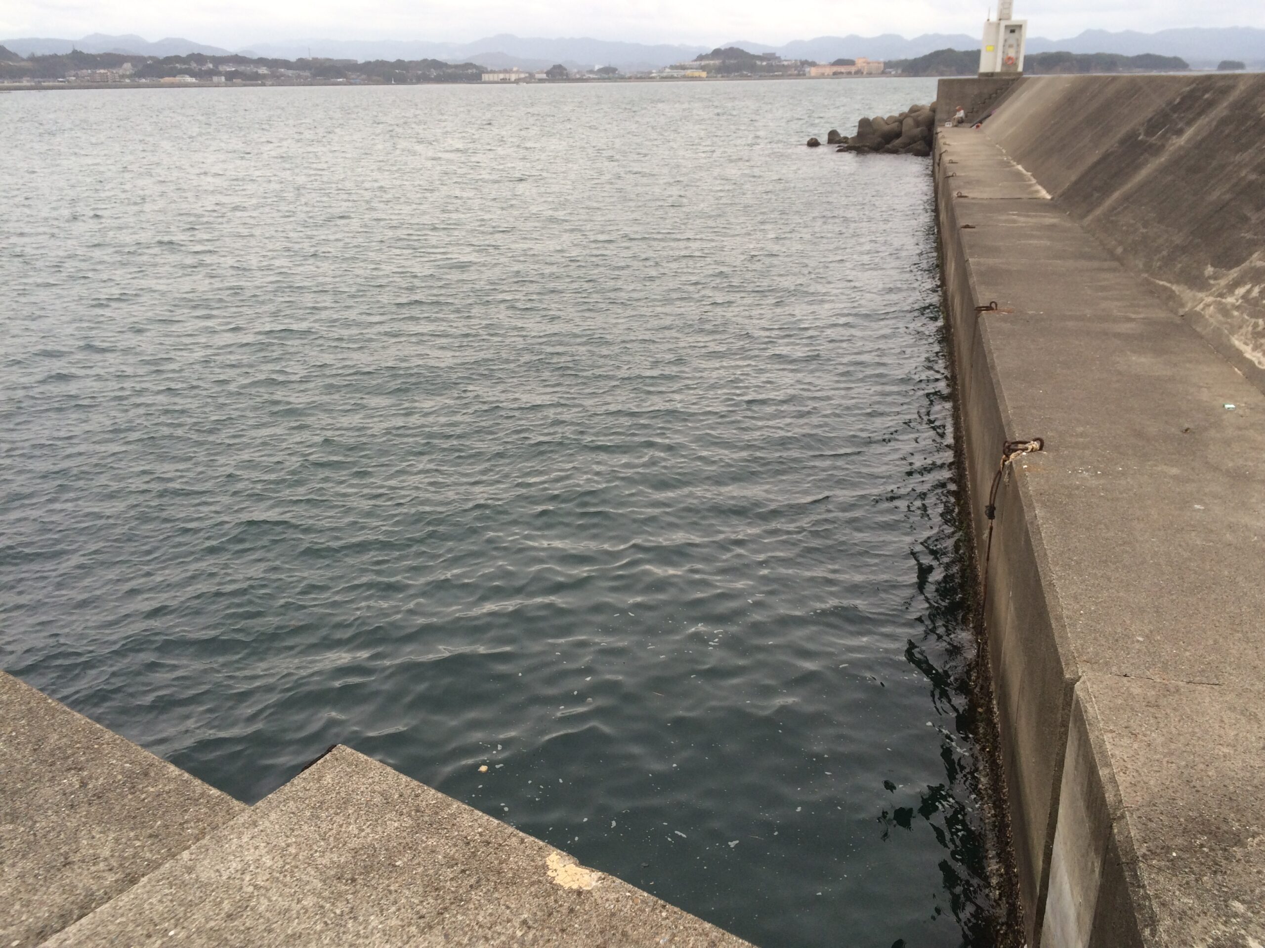 テトラポッド帯が広がり、外洋の潮が直接当たるため、グレ・チヌ・イサギなどの回遊魚が豊富