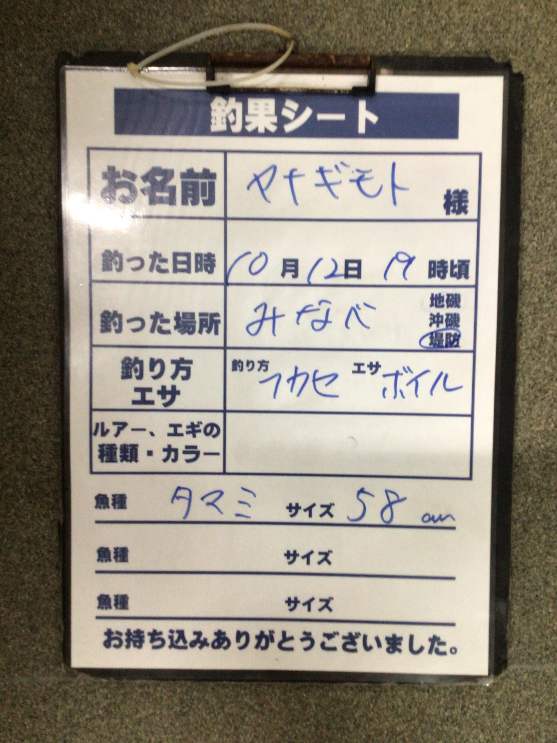 10月12日 ヤナギモト様 タマミ58㎝の釣果。