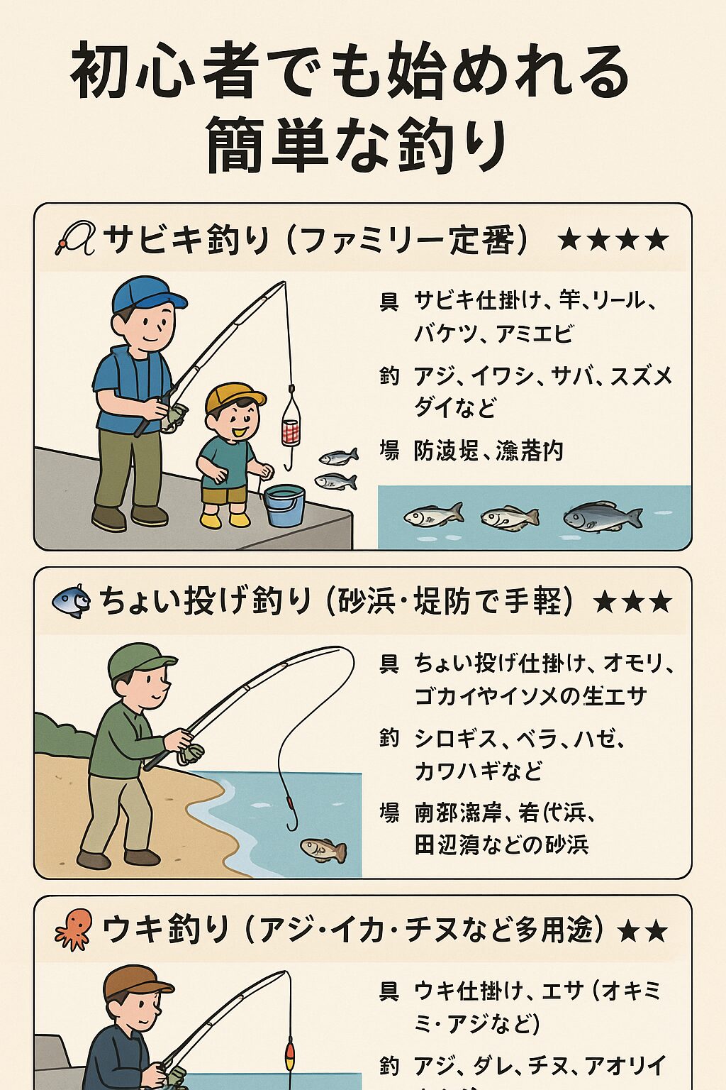 初心者でも始められる「簡単な釣り」は、道具が少なく・釣れる確率が高く・安全に楽しめることがポイントです。