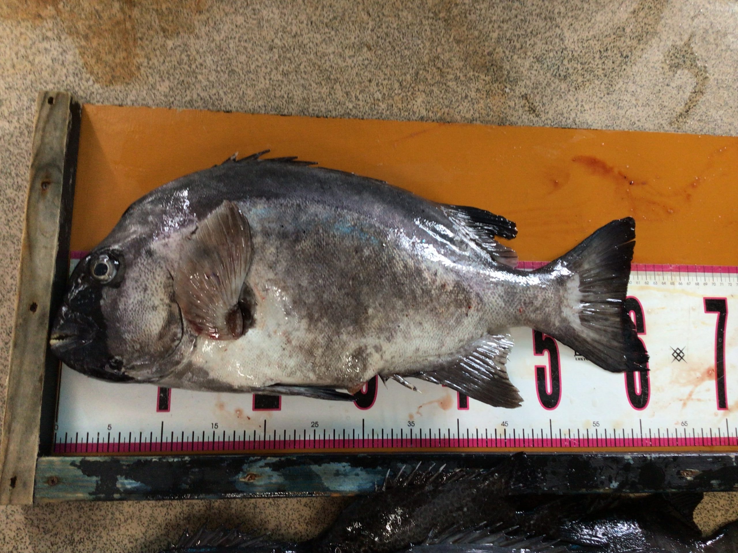 60cm クチグロを釣り上げた、名人K氏曰く 未分類 2025.10.28 釣ったときは、3~4cm大きかった。 軟骨が縮んで小さなるんや。 そんなに珍しくない大きさ。普通やな。 刺身や鍋にして食べてる。 ここまで大きなるんは、30年はかかるな。