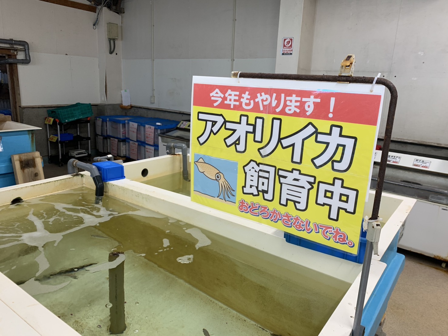 【みなべ店】今年もアオリイカ飼育に挑戦中です。 お知らせ 2025.10.16 みなべ店にてアオリイカを泳がせているので見に来て下さい。 運が良ければ、アジの捕食シーンが見られます! ビックリすると、墨を吐いたり弱ってしまいます。 驚かせないようにしてください。