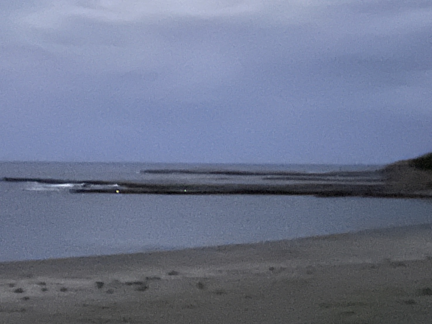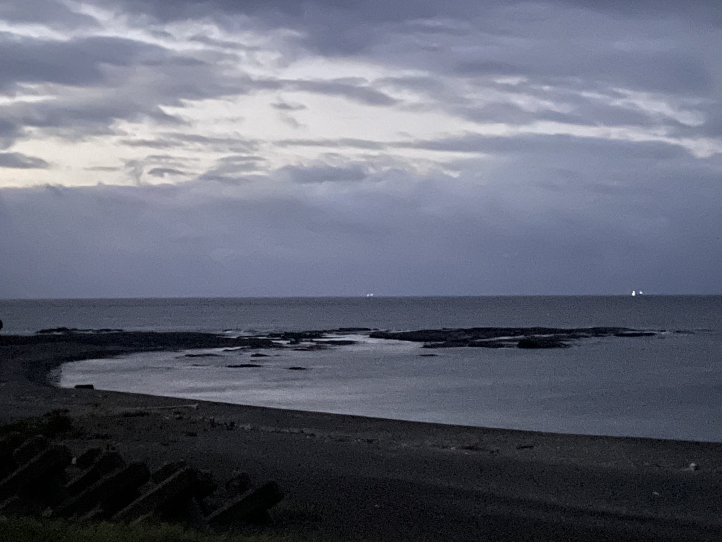 今朝は雲が多くて薄暗いです 志原磯には釣り人のライトが見えます