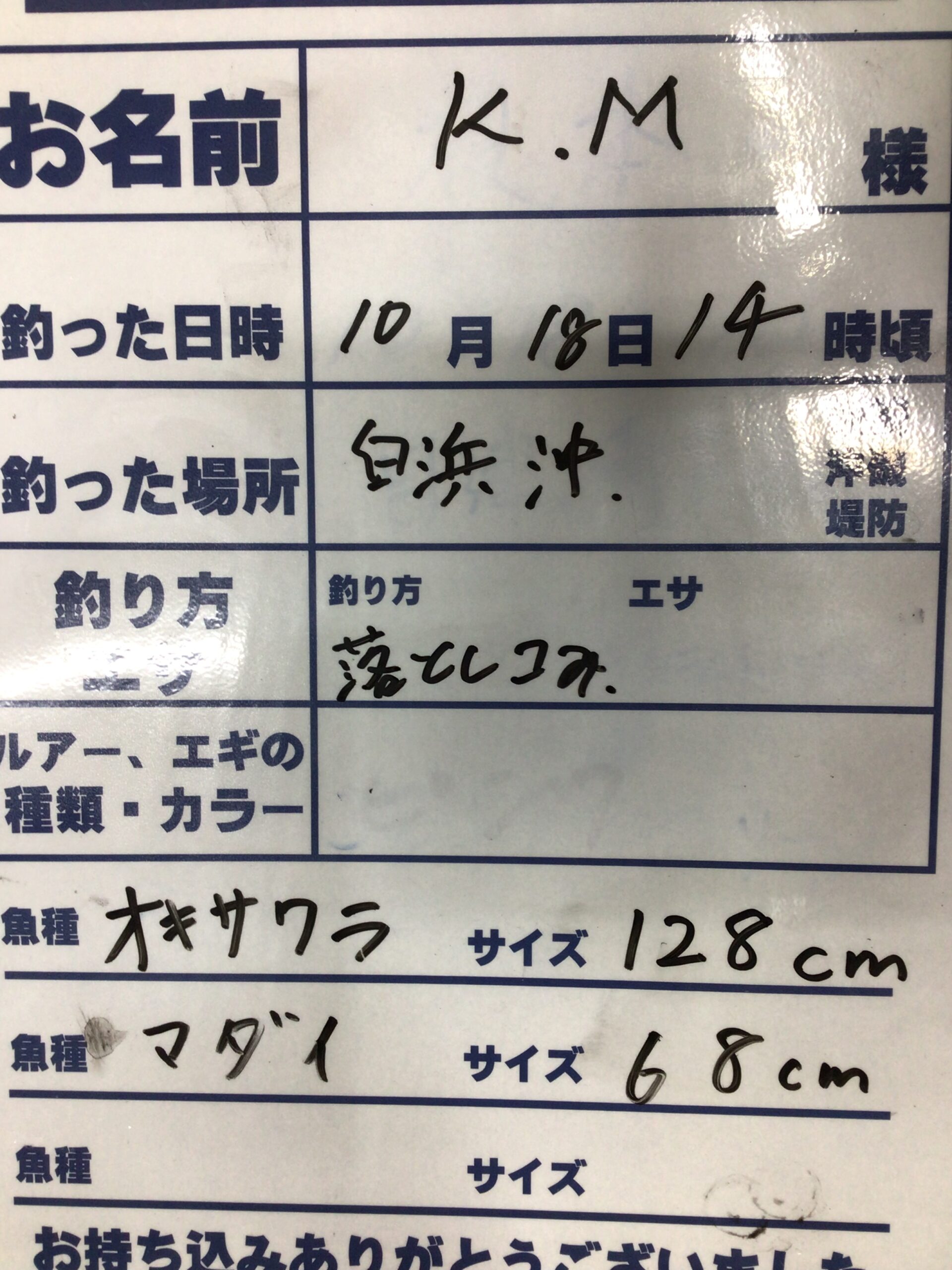 10/18(土)K.M様 白浜沖にてマダイ68㎝&オキサワラ128㎝の釣果!!!!