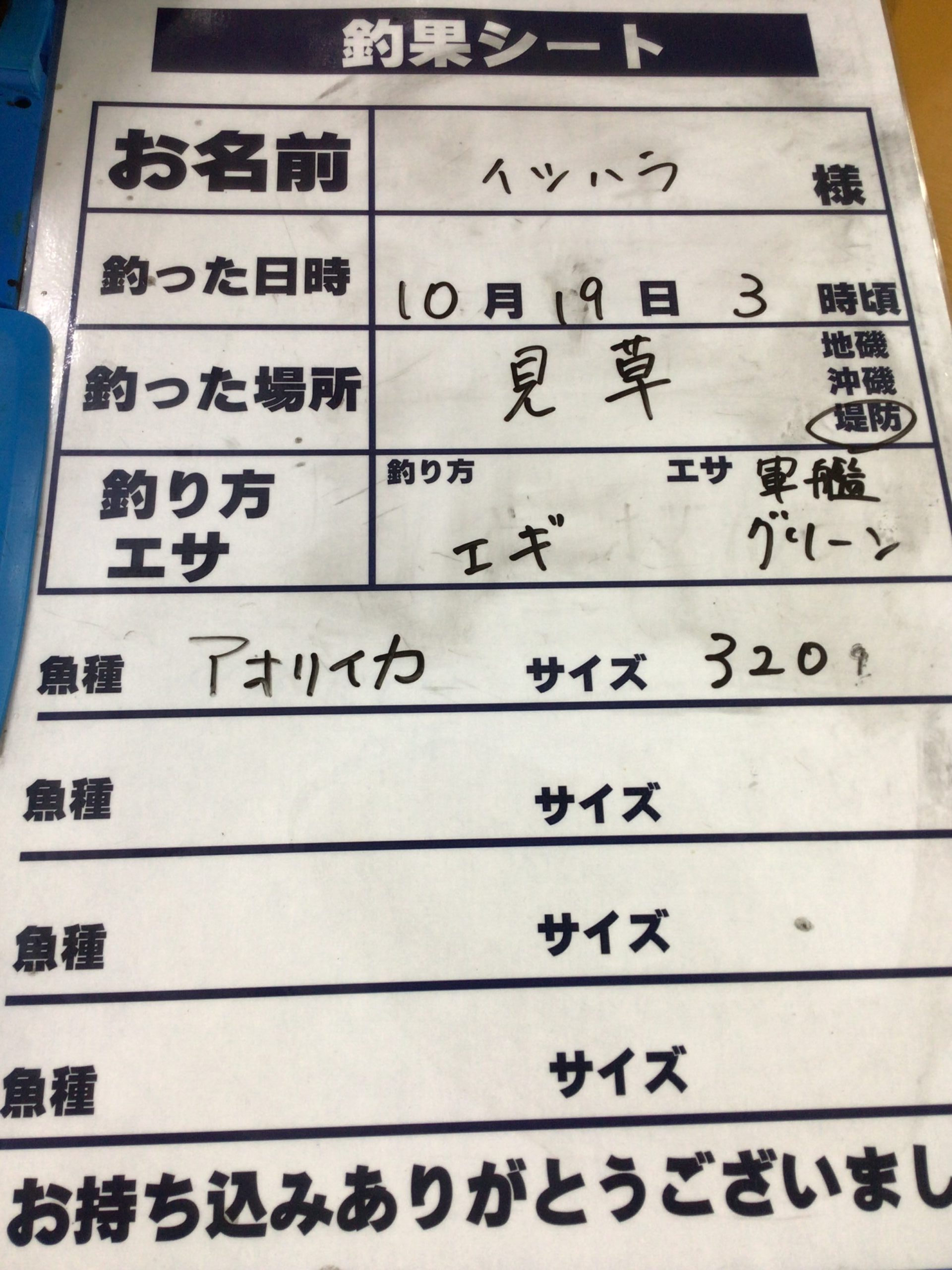 10/19 アオリイカの釣果 320g 見草漁港、エギングにて